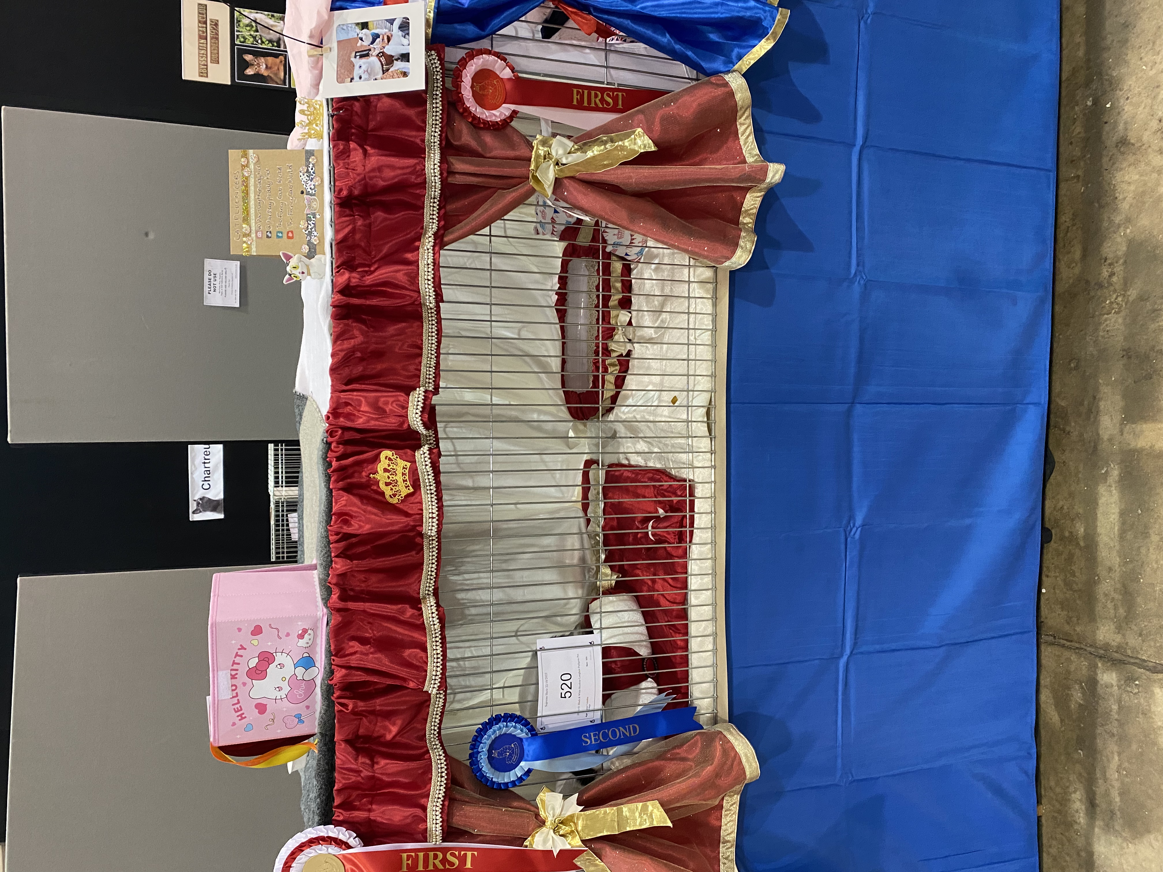Turquoise silk with an overlay of snowflake organza, complimented with hand sewn metallic snowflake bunting. With three piece cushion set and quilted bed plus litter tray cover.