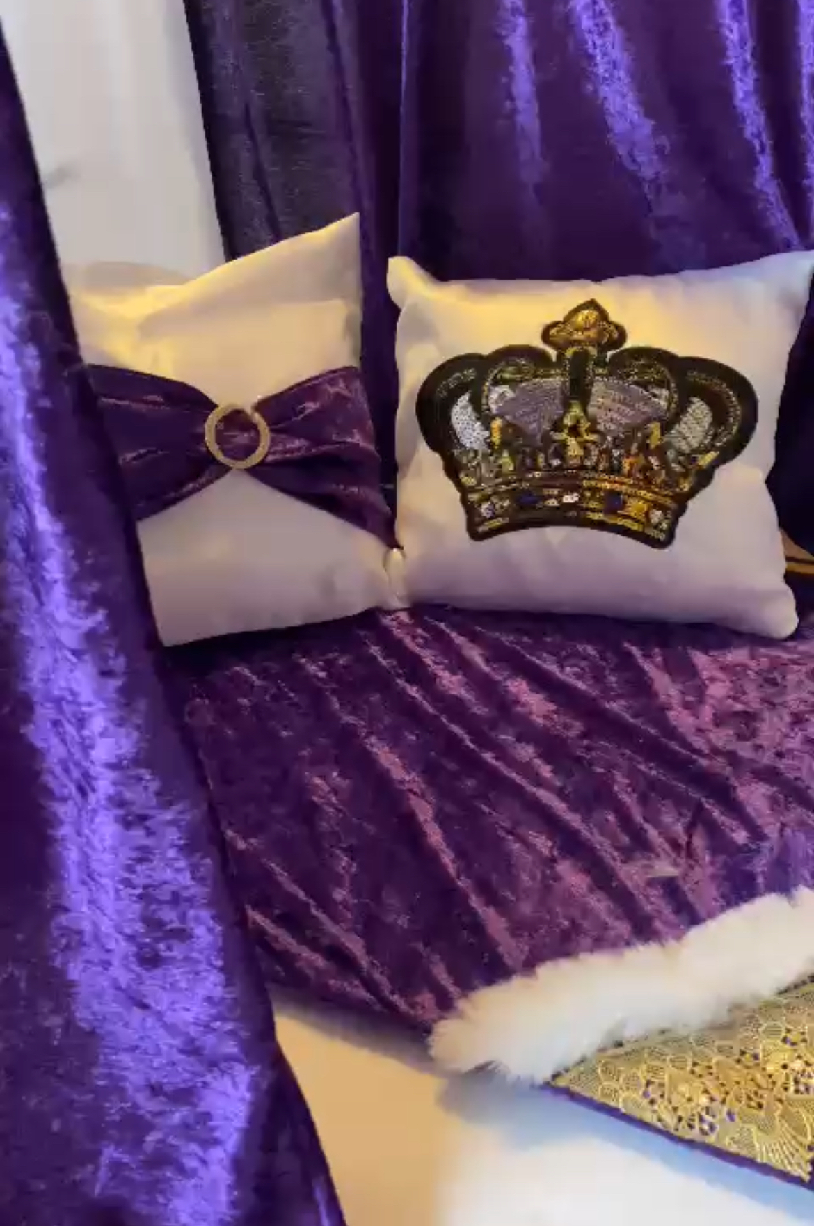 Two tone deep purple taffeta set with complimenting cream satin plus Champagne coloured ribbon. With three piece cushion set, quilted base & bed plus litter tray cover.