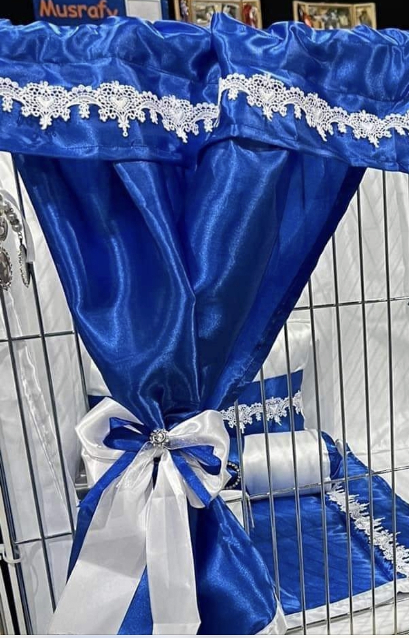 Royal blue satin set with accents of cream and added gold ribbon.With three piece cushion set, quilted base & bed plus litter tray cover.