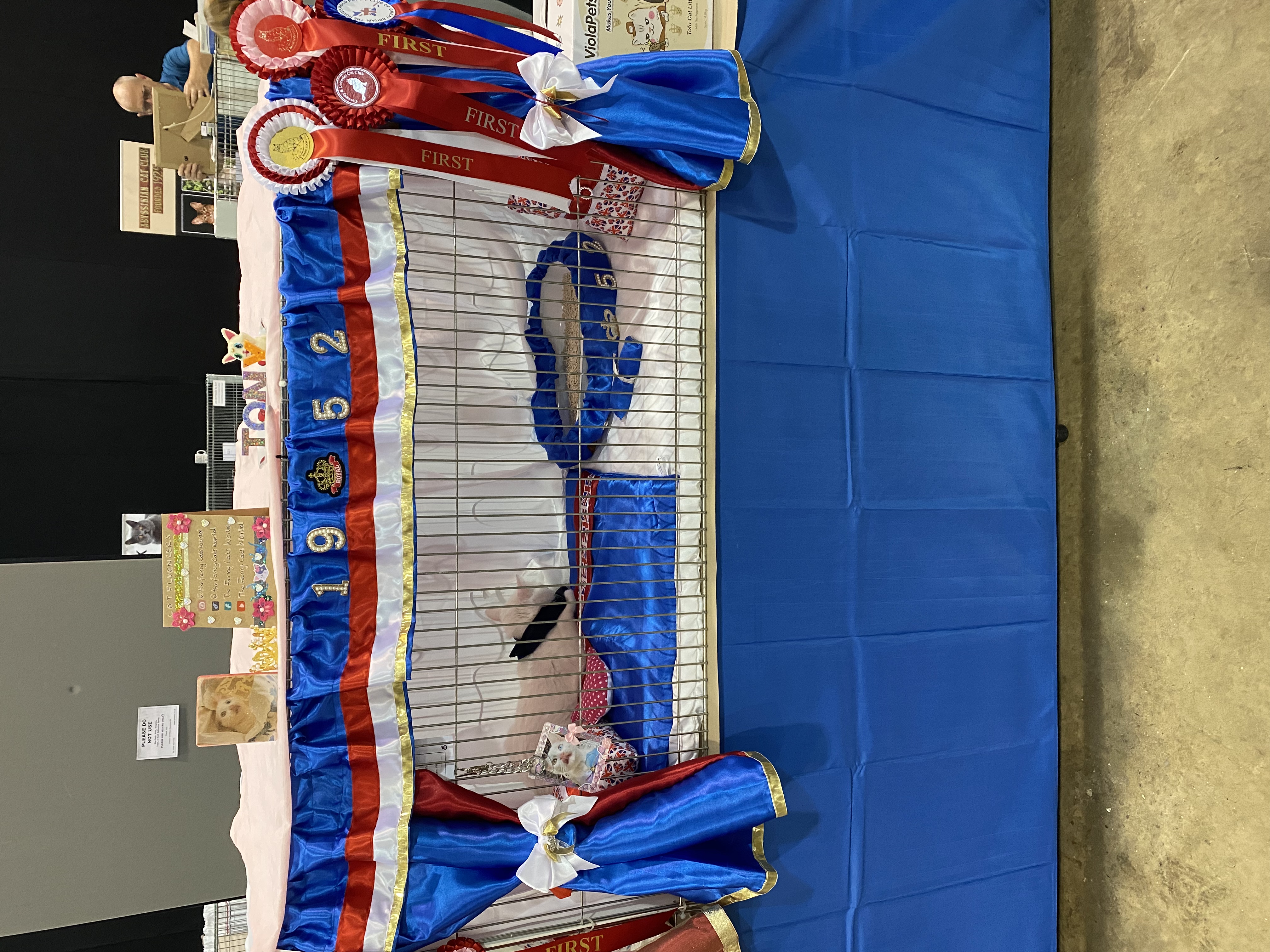 Royal blue satin set with accents of cream and added gold ribbon.With three piece cushion set, quilted base & bed plus litter tray cover.