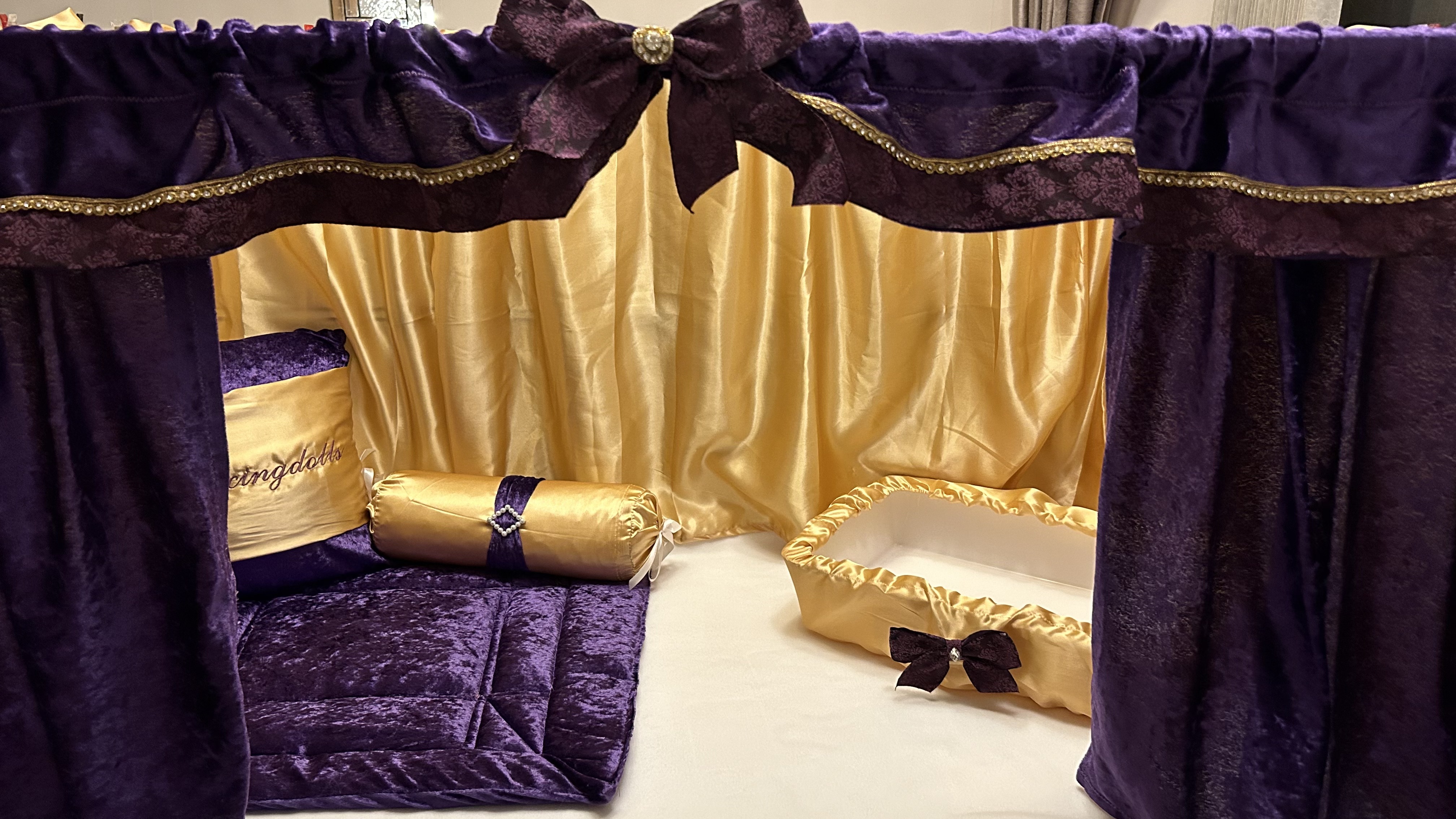 Two tone deep purple taffeta set with complimenting cream satin plus Champagne coloured ribbon. With three piece cushion set, quilted base & bed plus litter tray cover.