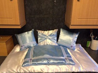 Turquoise silk with an overlay of snowflake organza, complimented with hand sewn metallic snowflake bunting. With three piece cushion set and quilted bed plus litter tray cover.